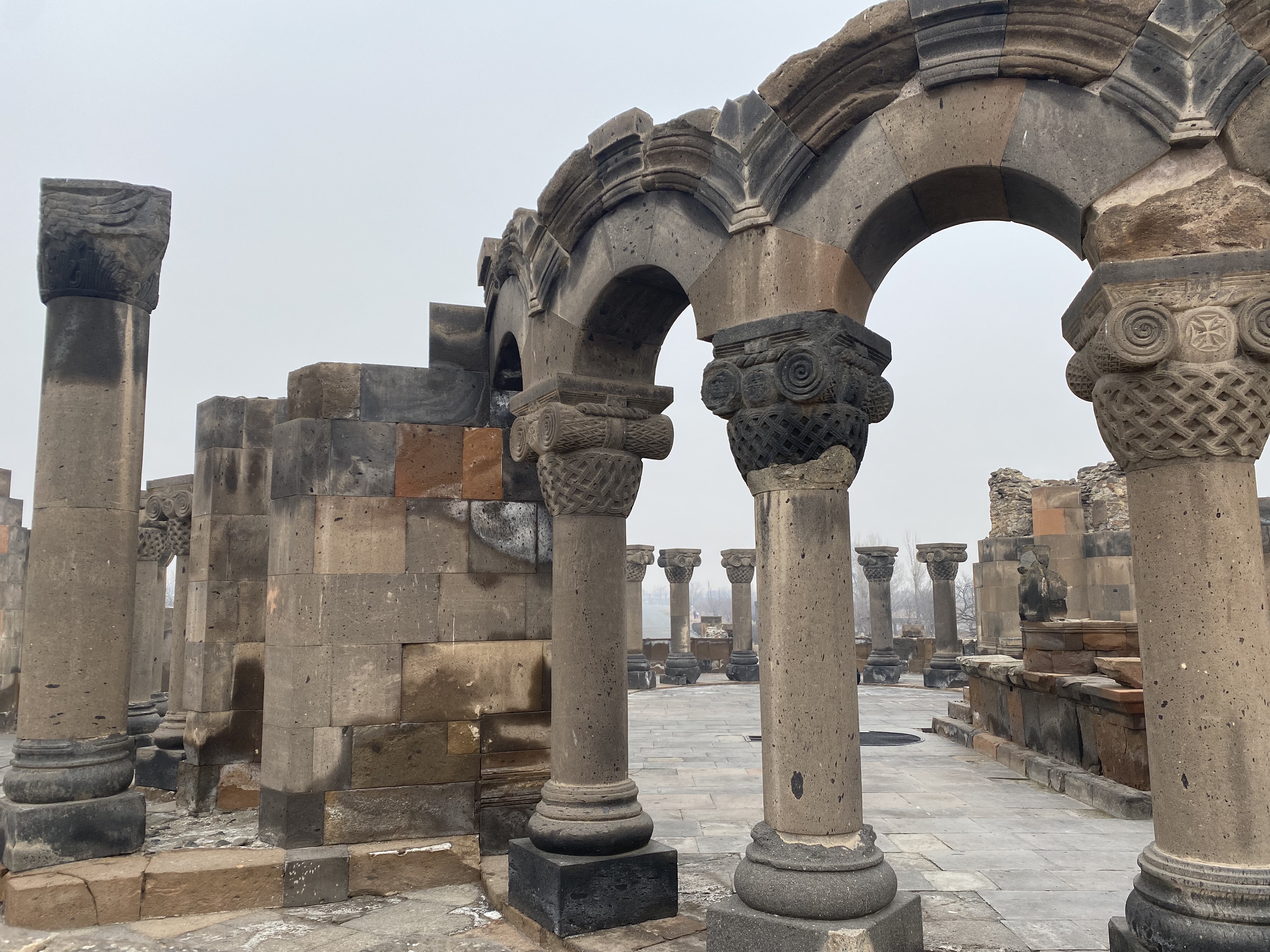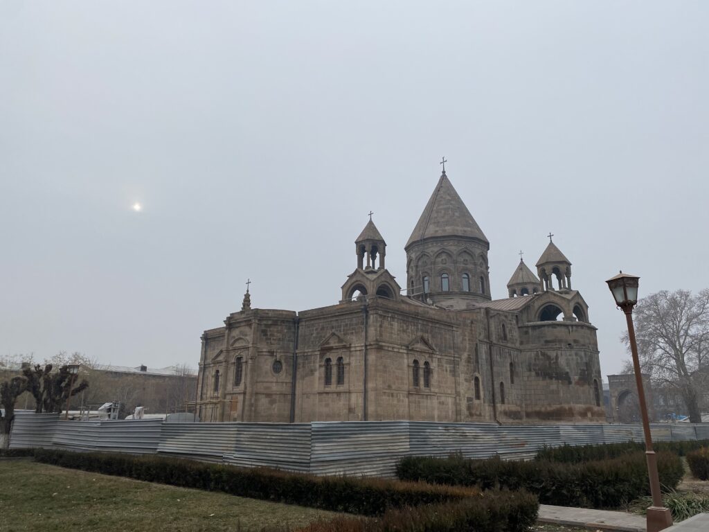 After a few days seeing the sites and eating lots of Armenian food, as well as lots of tacos (it was near our Airbnb!), we did a couple of day trips. The first one was near to Yerevan, so we went by taxi: first to the ruins of the Cathedral of Zvartnots, which on a clear day has a striking view of the mountains behind it (we were there on a foggy day, as were all the days we were in Armenia), and then to the city of Ejmiatsin to see the cathedral complex there, as well as the oldest church in the world.